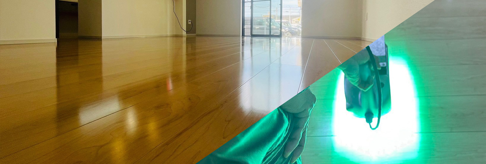 エスコートUVは紫外線硬化樹脂をフローリング表面に塗布し、紫外線照射機を使用することにより塗膜を瞬間硬化させるフロアコーティングです。