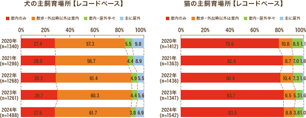 2024年では「室内のみ」「散歩・外出時以外は室内」の割合が犬猫ともに90%を超えています。